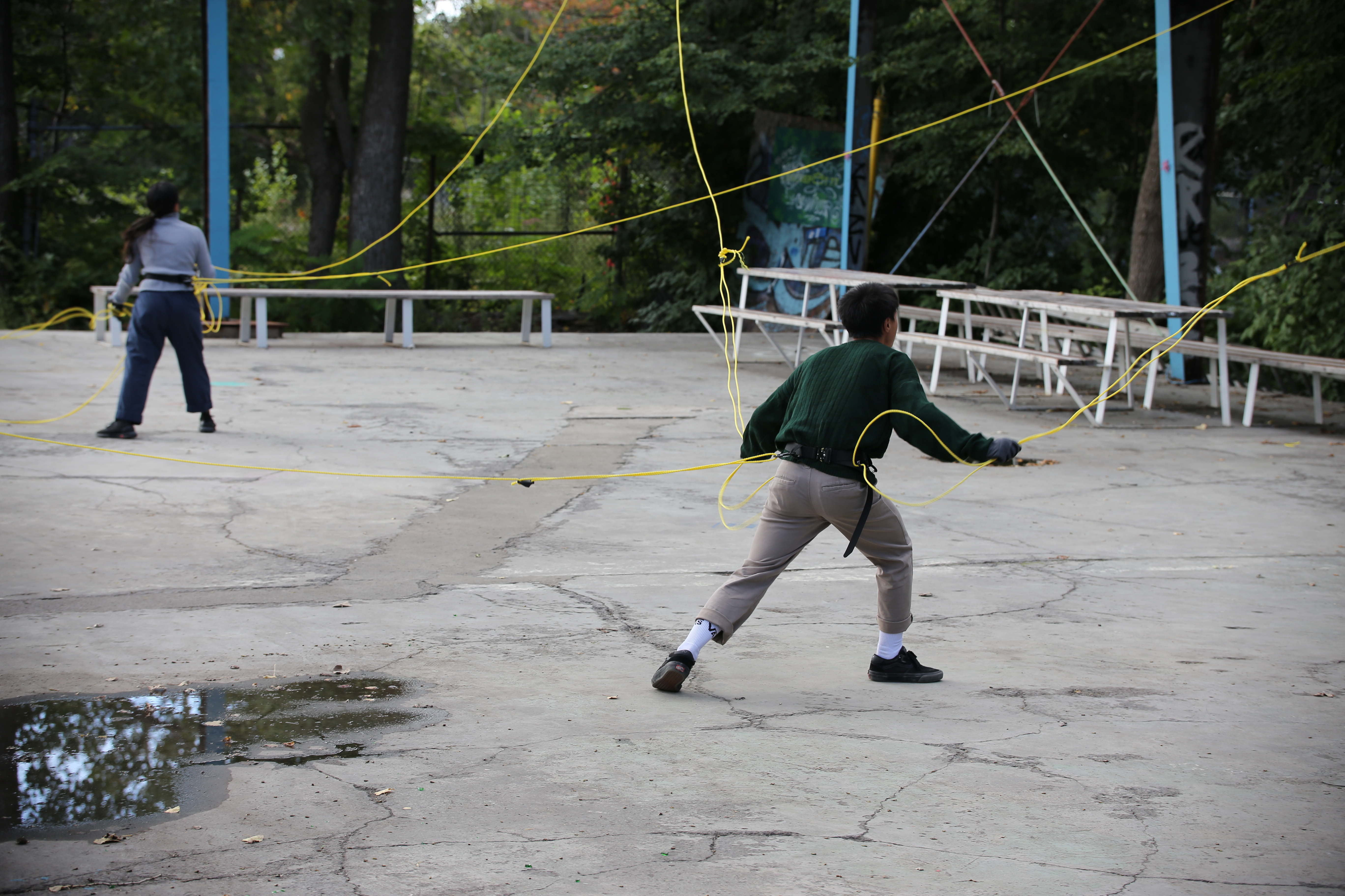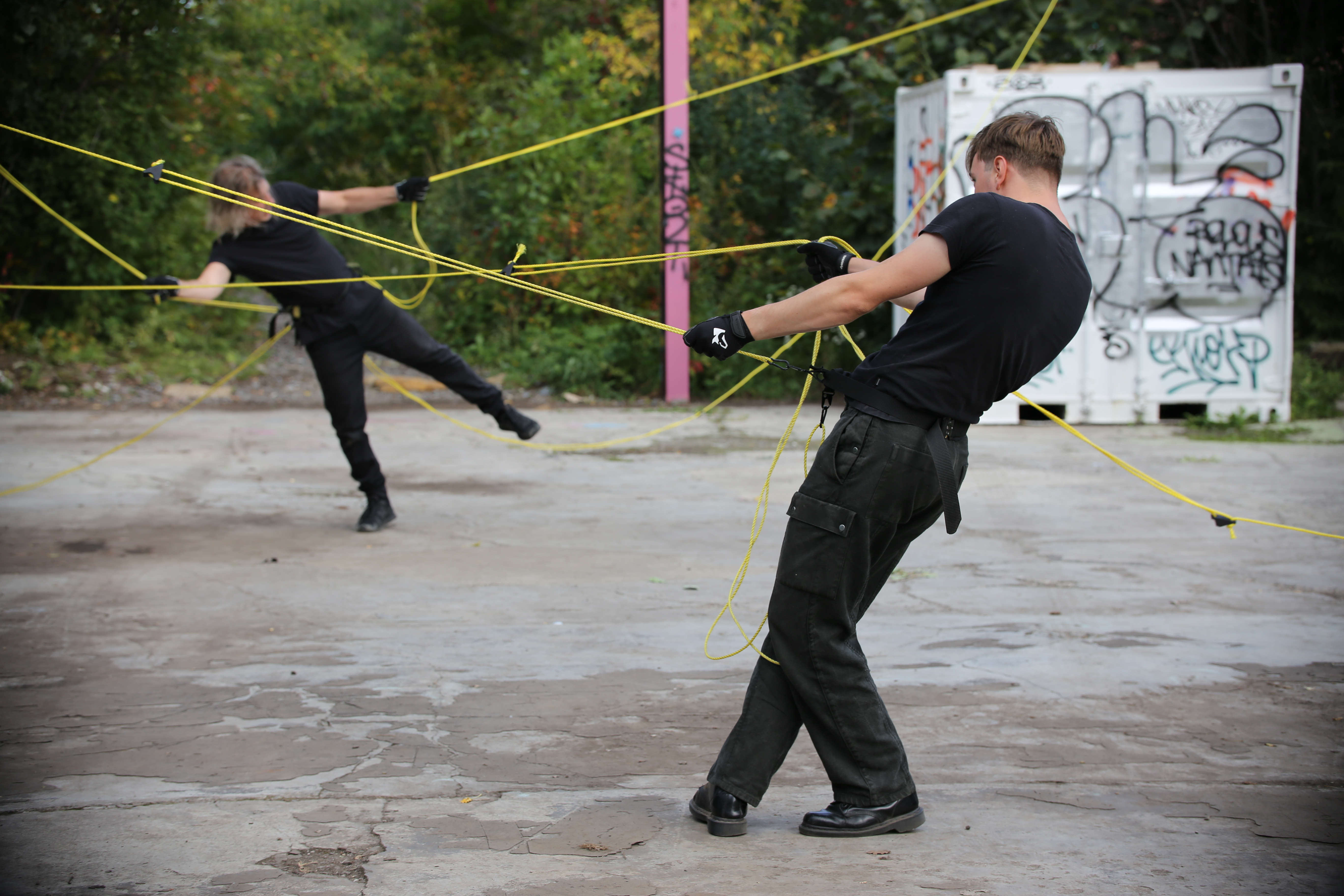The performance takes place at Entrepôt 77, a burned-down building located in the Mile-End neighborhood of Montreal, along the train tracks. The audience experiences the performance from the center of the structure, with two performers on each side. This arrangement creates an immersive experience reminiscent of a tennis match, where the constant movement of hammers and ropes draws the audience's attention from left to right, much like watching a tennis match but not only moving your head, but your whole body back and forth. The performance revolves around an interplay between the lines of the structure and the yellow ropes, which sometimes hang loosely and other times are pulled tight. The constantly shifting perspective of the audience creates a unique play of lines for each viewer.
